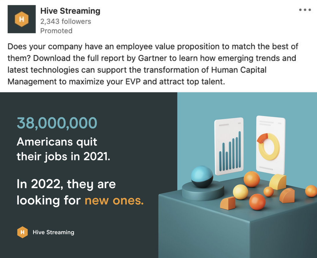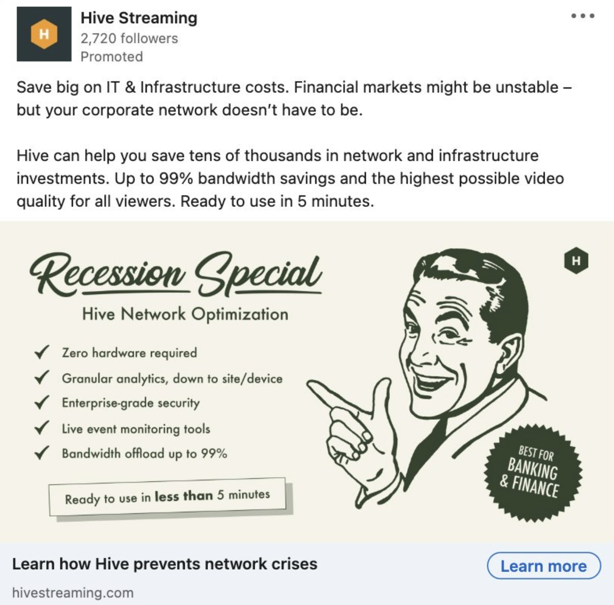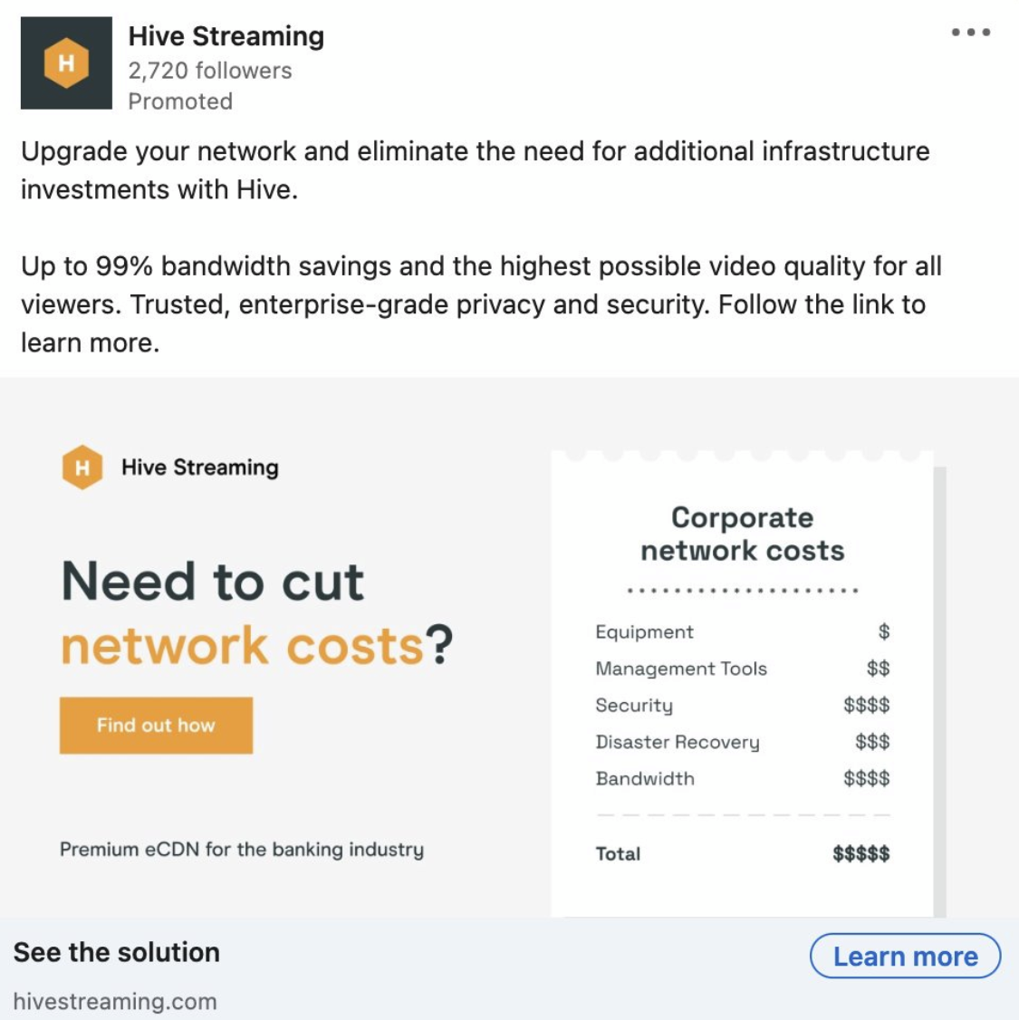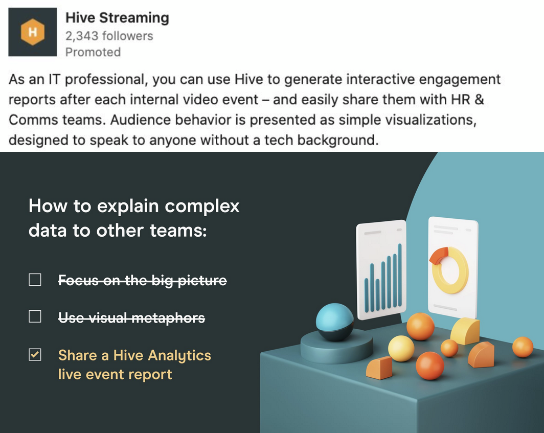 A selection of ads developed for targeted ABM campaigns during 2022-2025, featuring Hive's network optimization and employee video experience analytics products (targeting personas within IT & Infrastructure, Digital Workplace, and HR).